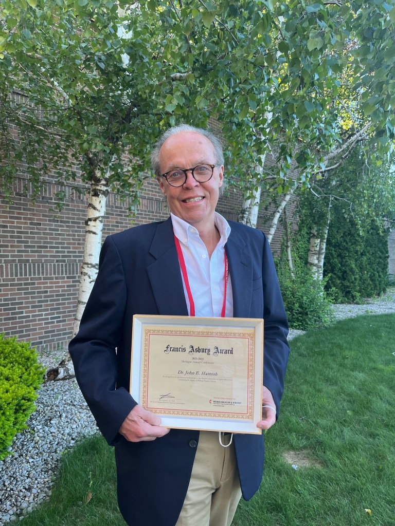 Annually, the General Board of Higher Education and Ministry recognizes individuals who have made a significant contribution to the church’s program of higher education and campus ministry with the “Frances Asbury Award”. This year the Michigan recipient was Front Edge author Rev. Dr. John E. Harnish.